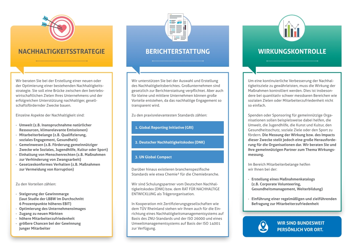 Das Thema wird für Kunden und andere Stakeholder von Behörden immer wichtiger. Die DAX-Unternehmen sind bereits zur Berichtersttattung verpflichtet. Aber auch für kleine und mittlere Unternehmen können große Vorteile entstehen. Im Bereich CSR/Nachhaltigkeit sind wir beispielsweise für das Förderprogramm in Sachsen-Anhalt als erste Beratungsgesellschaft gelistet. Wir können Ihnen auch in anderen Bundesländern eine Beratungsförderung von bis zu 50 % anbieten.